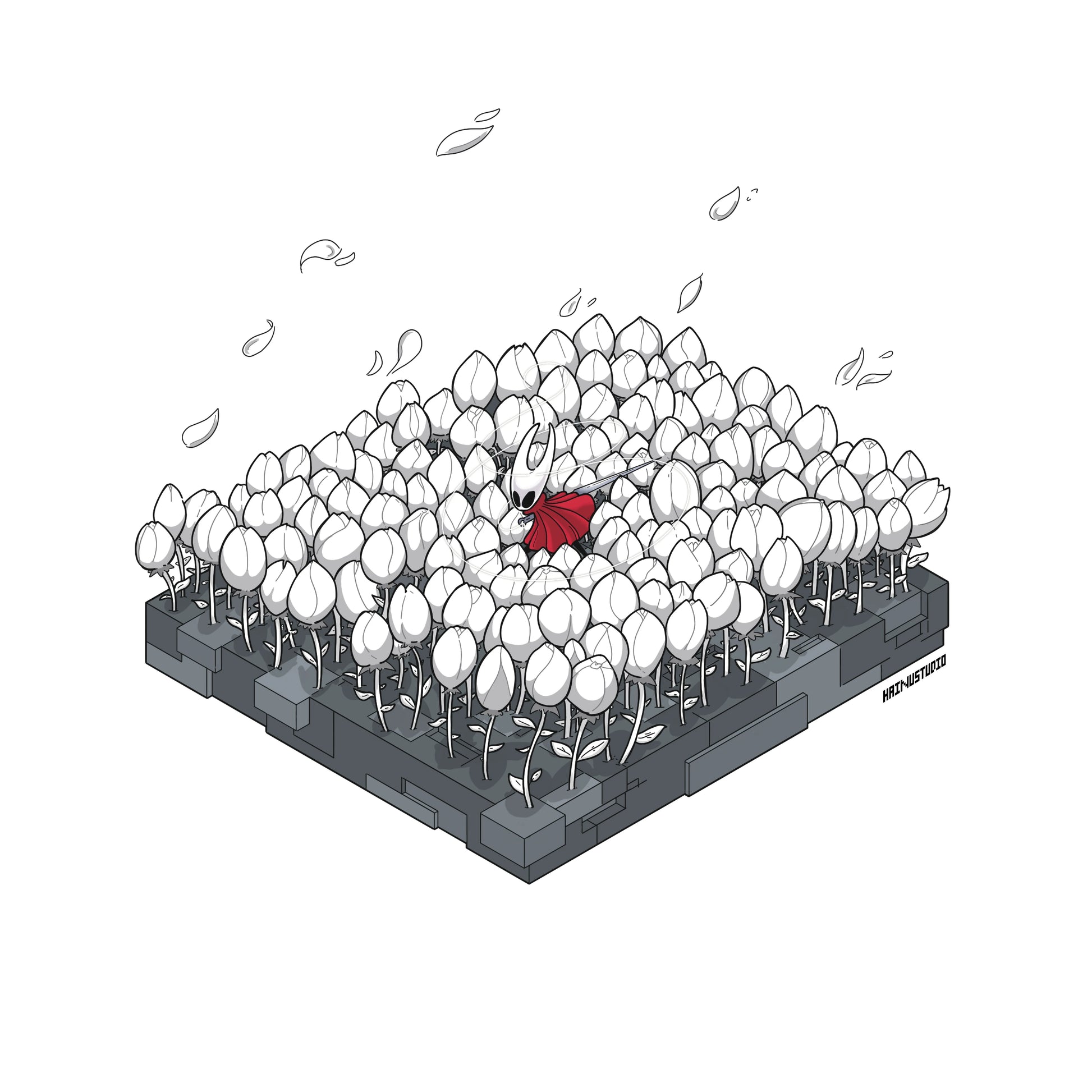 Cette illustration rend hommage à l’univers envoûtant de Hollow Knight, mêlant lumière et solitude, fragilité et puissance.