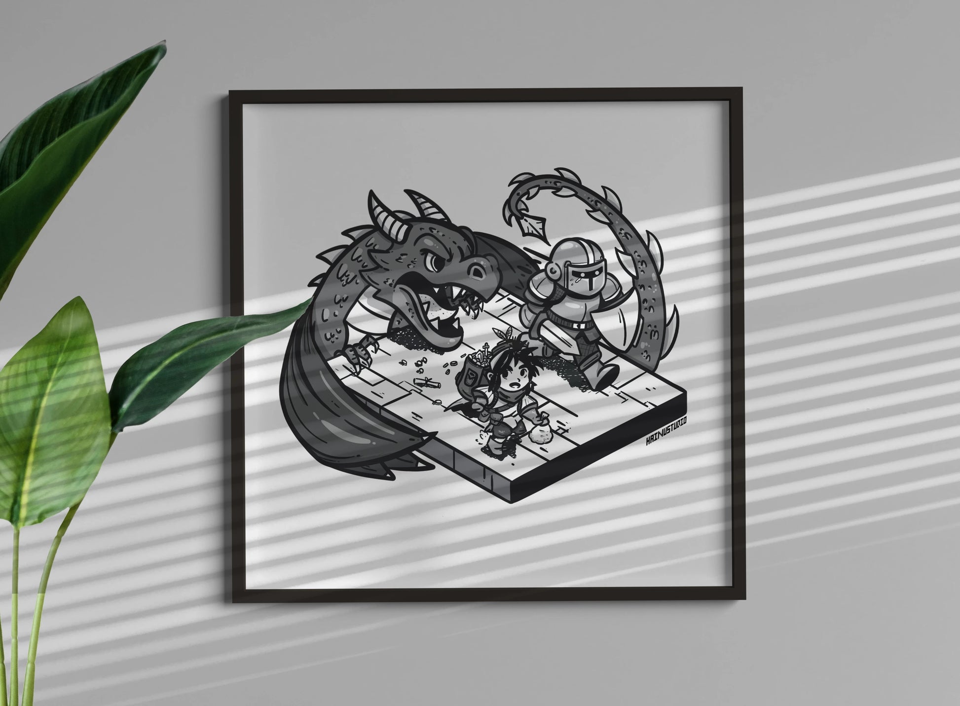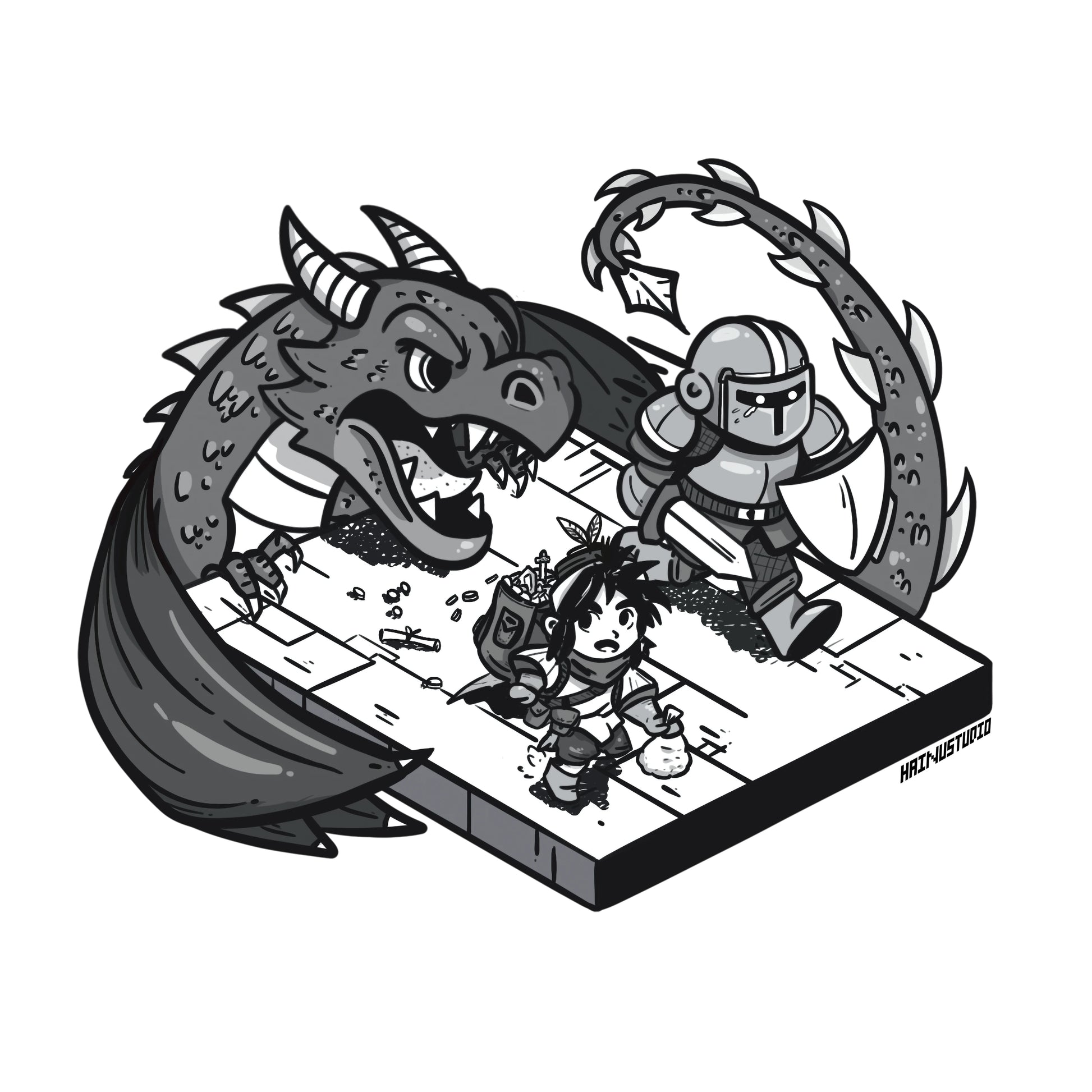 Sur une dalle d’aventure en vue isométrique, un dragon colossal se lance à la poursuite d’un chevalier téméraire et d’un voleur maladroit.