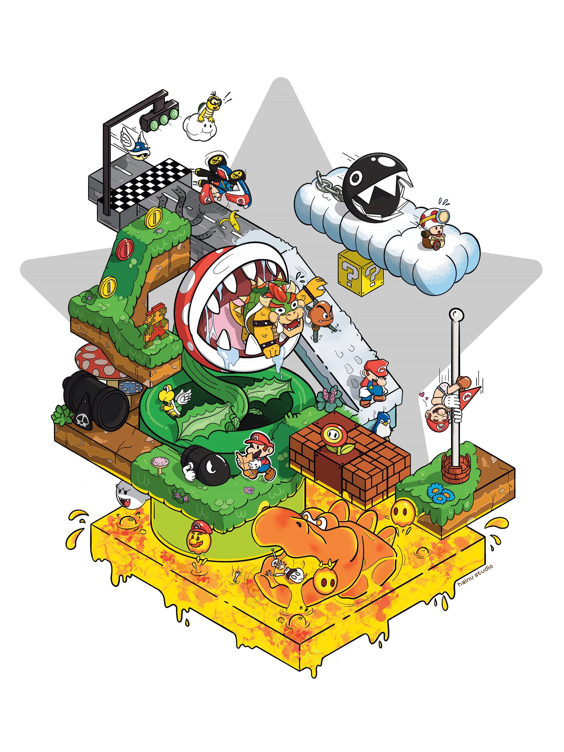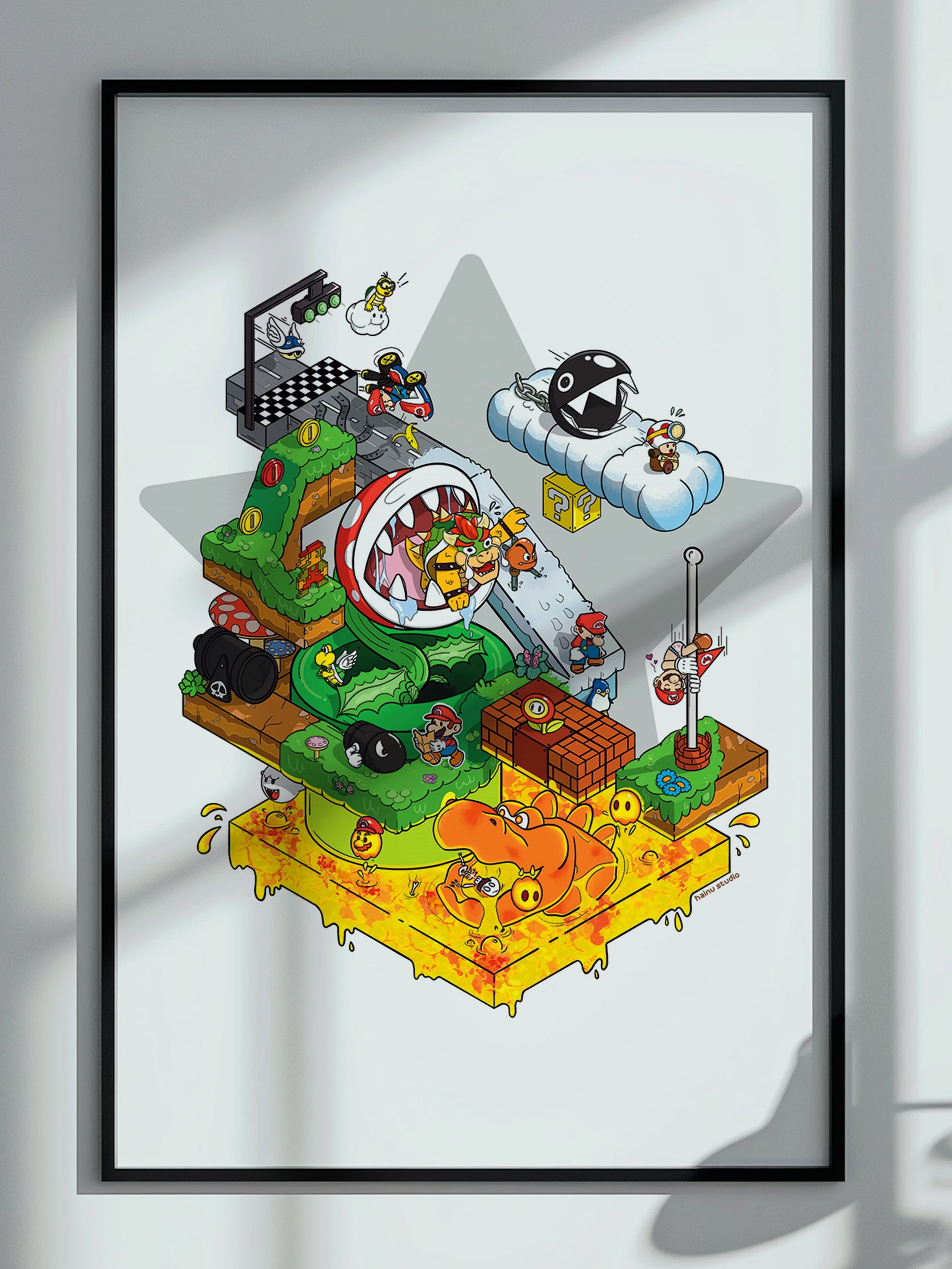 Bienvenue dans un monde où plateformes flottantes, tuyaux mystérieux et châteaux emblématiques prennent vie sous une nouvelle perspective. Cette illustration isométrique réinvente l’univers de Mario et rend hommage à plusieurs titres de la licence phare, dans un décor vibrant, plein de détails et de nostalgie.