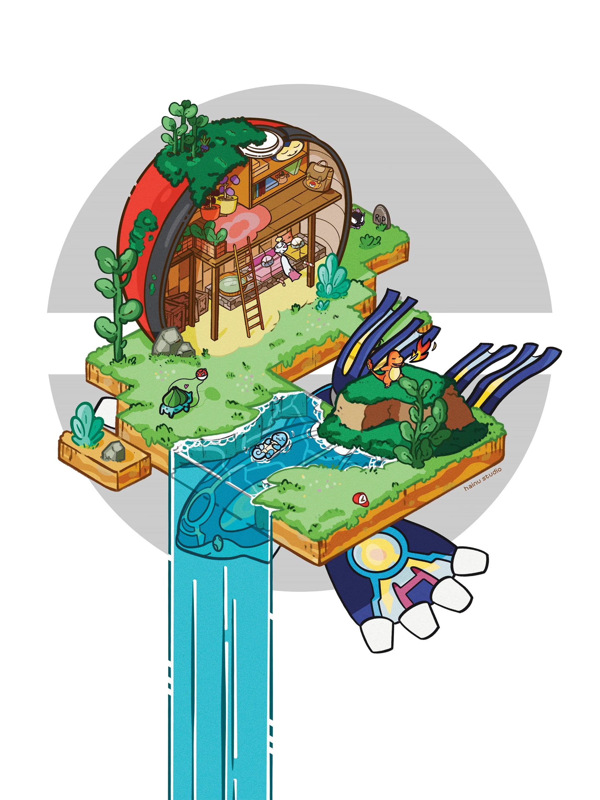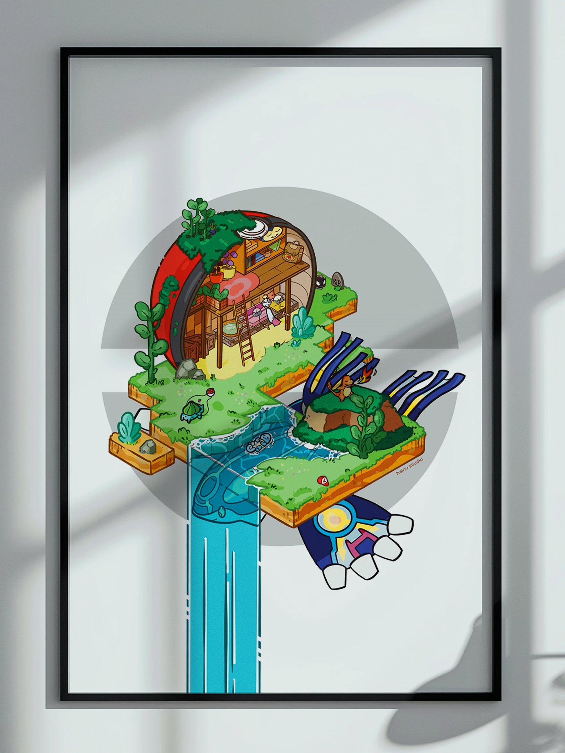 Découvrez un paysage isométrique où la nature et les Pokémon se mêlent dans une harmonie parfaite. Entre hautes herbes, routes sinueuses et maison Pokéball, chaque recoin de ce décor miniature regorge de vie et de mystères.